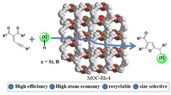 Alkynes, as emerging non-diazo carbene precursors, have been gaining much attention recently [,]. Increasing numbers of carbene transfer reactions are being reported, starting from functionalized alkynes under the catalysis of transition metals. Dirhodium complexes have shown high reactivity and selectivity in reactions with alkynes as carbene precursors, especially asymmetric processes [,,,]. However, to the best of our knowledge there is no report on the heterogeneous version. Herein, we demonstrated the insertions of alkyne-derived carbene into Si-H and B-H bonds in the presence of a dirhodium-based metal–organic cage (MOC-Rh-1) as a heterogeneous catalyst (Figure 1). The reactions feature a mild reaction condition, high efficiency with up to 97% isolated yield, and a broad substrate scope. The catalyst showed excellent recyclability and could be reused for ten runs. Moreover, size selectivity was observed in the MOC-Rh-1-promoted B-H insertion.