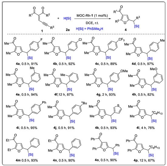 Substrate scope for the Si-H insertion reactions of various enynones 1 with 2a, H[Si] = PhSiMe2H. The reactions were performed at r.t. for 1 h under air with 0.2 mmol of 1, 2.0 equiv. of 2a and 1 mol% of MOC-Rh-1. Isolated yield.