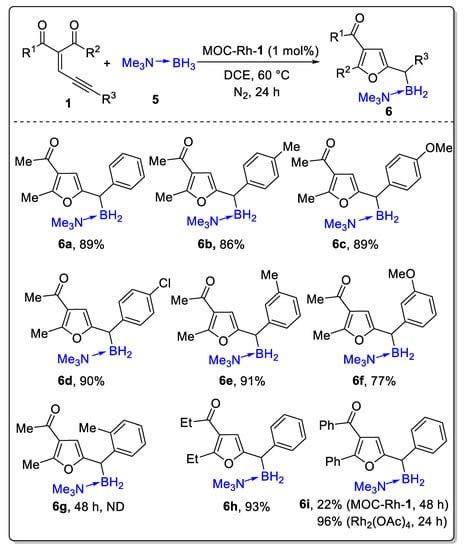 Substrate scope for the B-H insertion reactions of various enynones with trimethylamine borane 5. The reactions were performed at 60 °C for 24 h under N2 atmosphere with 0.2 mmol of 1, 2.0 equiv. of 5 and 1 mol% of MOC-Rh-1 unless otherwise noted. Isolated yield.