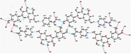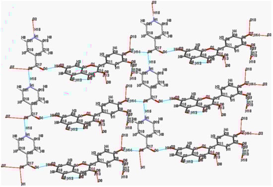 The two-dimensional hydrogen bond network in the baicalein–nicotinamide cocrystal [] is shown in Figure 4. Nicotinamide molecules form two types of parallel molecular chains in converse ordinations through N2-H12···O6 (2.23 Å, 145°) hydrogen bonds, and their amide moieties interact with the ortho-phenyl groups of adjacent baicalein molecules via O5-H3···O6 (1.94 Å, 154°) and N2-H11···O4 (2.33 Å, 121°) hydrogen bonds to form heterodimers, while their pyridine nitrogen atoms interact with the neighboring baicalein molecules in the other direction through O4-H2···N1 (1.91 Å, 155°) hydrogen bonds. Every baicalein molecule is connected with two nicotinamide molecules in different chains via O5-H3···O6 (1.94 Å, 154°), N2-H11···O4 (2.33 Å, 121°) and O4-H2···N1 (1.91 Å, 155°) hydrogen bonds, thus forming a tetramer consisting of two baicalein molecules and two nicotinamide molecules. The tetramer extends along the direction parallel to nicotinamide chains to form the hydrogen-bonded networks.