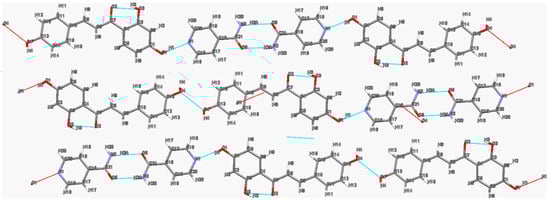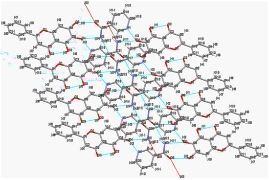 The two-dimensional hydrogen bond network of the isoliquiritigenin–isonicotinamide (ISL-INM) cocrystal [] is displayed in Figure 5. Obviously, ISL and INM molecules are assembled into a sheet structure in their cocrystal. The amide moiety of two adjacent INM molecules is connected by two N2-H2A···O5 (2.03 Å, 172°) hydrogen bonds to form an (8) homodimer, which is connected to the neighboring ISL molecules through the O1-H1···N1 (1.89 Å, 162°) hydrogen bond. The central INM dimer is capped by a flavonoid molecule at each end, forming a 0-D motif. Then, the 0-D motifs interact with each other through N2-H2B···O2 (2.25 Å, 168°) and C14-H14···O1 (2.56 Å, 156°) hydrogen bonds to form a 2D sheet structure. Meanwhile, the oxygen atoms (O4) of phenol groups on the adjacent ISL molecules face each other in a close-packed arrangement, which helps to arrange 0-D motifs into a line []. Different from other packing types (such as serrated layer), the molecules in the ISL-INM cocrystal are packed into flat layers with relatively large spacing. Under the influence of shear stress, it is easier to slide between neighboring layers, which may lead to higher plasticity and better tableting performance [,].