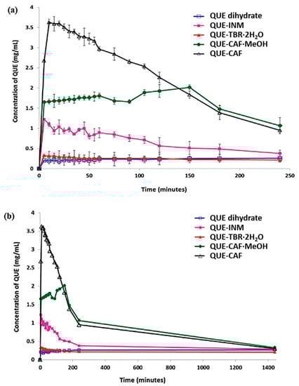 Dissolution profiles of QUE dihydrate and QUE cocrystals in 1:1 methanol/water mixture during (a) the first 4 h and (b) 24 h. Adapted from [] with permission. Copyright © 2011 American Chemical Society.