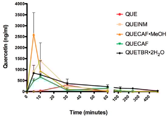 Pharmacokinetic profiles of QUE preparations (mean plasma concentration + SD, n = 3). Statistical significances were achieved between QUE-INM and QUE at t = 10 min (p < 0.01) and between QUE-CAF·MeOH and QUE at t = 5 min (p < 0.001), respectively. Adapted from [] with permission. Copyright © 2011 American Chemical Society.