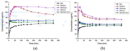 Powder dissolution profiles of Bai and its four cocrystals (BaiInia (baicalein–isoniazide), BaiInam (baicalein–isonicotinamide), BaiCaf (baicalein–caffeine) and BaiTph·H2O (baicalein–theophylline monohydrate)) in (a) pH 2.0 and (b) pH 4.5 buffer solutions. Adapted from [] with permission. Copyright © 2017 American Chemical Society.