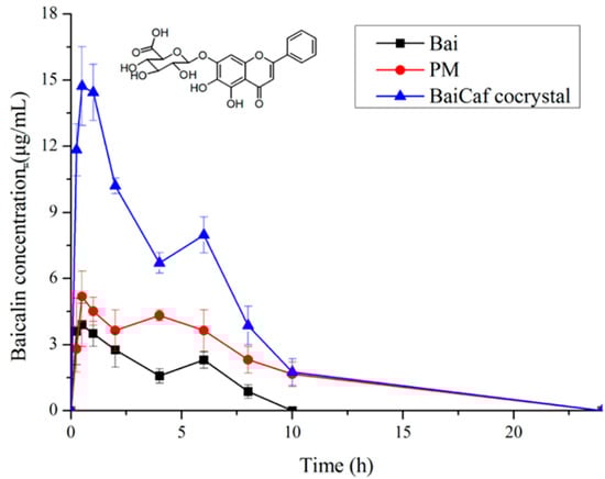 Plasma BG concentration–time curves of the crystalline Bai, PM and BaiCaf cocrystal (data are expressed as means ± SD, n = 6). Adapted from [] with permission. Copyright © 2017 American Chemical Society.