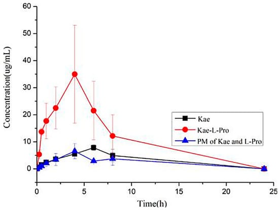 In addition, kaempferol with tetrahydroxyflavone structure is one of the most common aglycone flavonoids, which exists in various parts of plants in the form of glycosides, including seeds, leaves, fruits, flowers and even vegetables. It has been proven that kaempferol and its glycosylated derivatives have a variety of pharmacological activities, such as osteoprotective, anticancer, neuroprotective, anti-inflammatory, antidiabetic, antioxidant, antimicrobial, chemo-preventive and therapeutic activities [,,,,,,]. However, like other flavonoids mentioned above, the solubility of kaempferol in water is very low, which leads to poor absorption in vivo [,,]. Recently, a kaempferol-L-proline cocrystal was synthesized, and its solubility and bioavailability are higher than those of pure kaempferol []. The dissolution experiment of the powders in a 0.5% Tween 80 system showed that the maximum solubility of the kaempferol-L-proline cocrystal was about 270% higher than that of pure kaempferol. Meanwhile, the pharmacokinetic curves of kaempferol (Kae), the kaempferol-L-proline (Kae-L-Pro) cocrystal, and a physical mixture (PM) of kaempferol and L-proline are presented in Figure 10. As the main metabolite of Kae in blood, the pharmacokinetic parameters of Kae-3-O-glucoside were provided and analyzed. The results showed that the pharmacokinetic curve of the Kae-L-Pro cocrystal was improved compared with the pure Kae component and corresponding physical mixture, and its Cmax and AUC0–24h were 369% and 351% higher than those of the pure Kae, respectively.