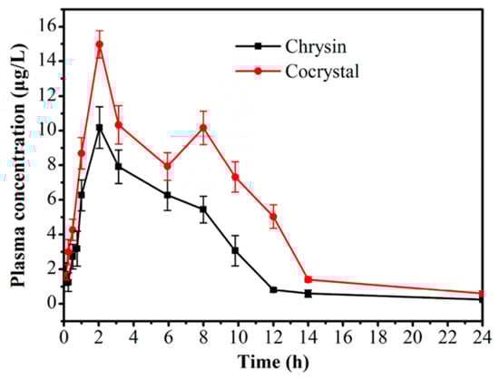 Mean plasma concentrations versus time profiles of chrysin and cocrystal. Adapted from [] with permission. Copyright © 2018 American Chemical Society.