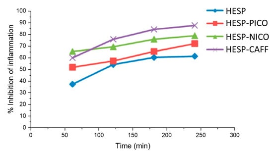 Percent inhibition of inflammation of HESP, HESP-PICO, HESP-NICO and HESP-CAFF. Adapted from [] with permission. Copyright © 2017 American Chemical Society.