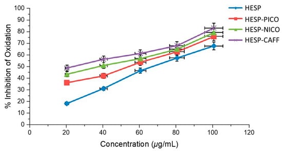 Percentage inhibition of oxidation of DPPH radical by hesperidin and the cocrystals. Adapted from [] with permission. Copyright © 2017 American Chemical Society.
