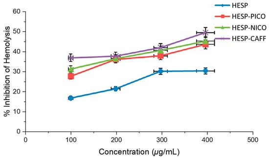 Antihemolytic activity represented as the percentage inhibition of hemolysis by hesperidin and the cocrystals. Adapted from [] with permission. Copyright © 2017 American Chemical Society.
