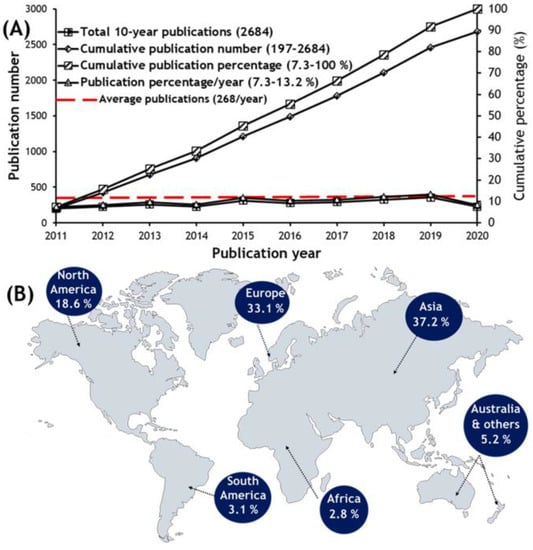(A) Research trend on marine derived peptides from 2011 to 2020, and (B) the global distribution in terms of publication number and percentage. (Reprint with permission from [42], Copyright (2021) ELSEVIER).
