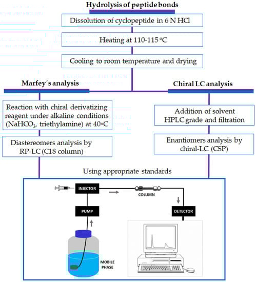 Regarding the chiral LC method, determination of the absolute configurations is developed by a direct analysis of the amino acid residues present in the acid hydrolysate without prior derivatization. First, enantioseparation of standards amino acids is performed on a chiral stationary phase (CSP). Then, comparison and/or co-injection of hydrolysate with the amino acids standards is performed, under the same chromatographic conditions, leading to the identification of the amino acid constituents [110].