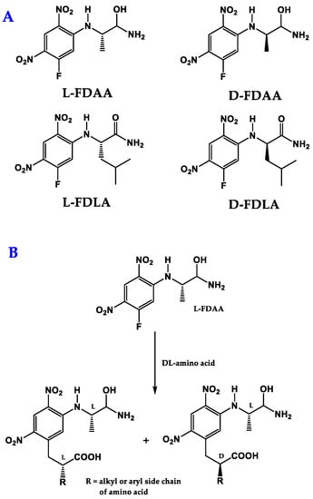 In Marfey´s method, after the acidic hydrolysis of peptides, the amino acid residues are derivatized with suitable chiral derivatizing reagents (CDRs). The reagents 1-fluoro-2,4-dinitrophenyl-5-d,l-alanine amide (FDAA) and 1-fluoro-2,4-dinitrophenyl-5-d,l-leucine amide (FDLA) (Figure 3A) are the most widely used [110].