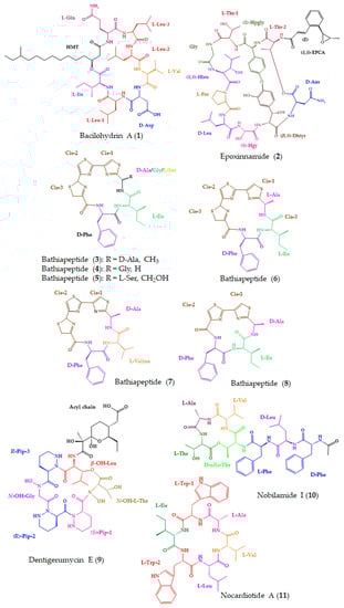 One of the most described biological activities associated to marine-derived cyclopeptides is anticancer activity [185]. Consistent with similar findings in previous works, several isolated marine peptides exhibited cytotoxicity. Among the 91 new marine-derived cyclopeptides, 43 showed promising results regarding anticancer activity and 11 (1–11) were isolated from marine-derived bacteria (Figure 6). Marine-derived bacteria have been shown to be a rich source of natural products, including cyclopeptides [71,186]. Bacterial natural products constitute 29% of Food and Drug Administration (FDA)-approved natural product-derived drugs, which mostly function as antitumor or antibacterial agents [187].