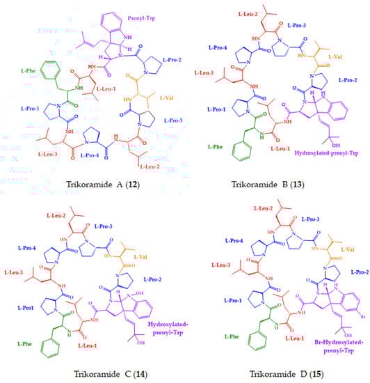 Later, the same group isolated another three cyanobactins, trikoramides B–D (13–15) (Figure 7), from the same samples. Compounds 13–15 are analogues of 12. The main difference in their structures is in the C-prenylated cyclotryptophan unit. Marfey’s method, in combination with the ECD spectra and NOESY correlations, were applied to determine their absolute structures. Compounds 13 and 15 showed cytotoxicity against the MOLT-4 cell line, with IC50 values of 5.2 µM and 4.7 µM, respectively [155].