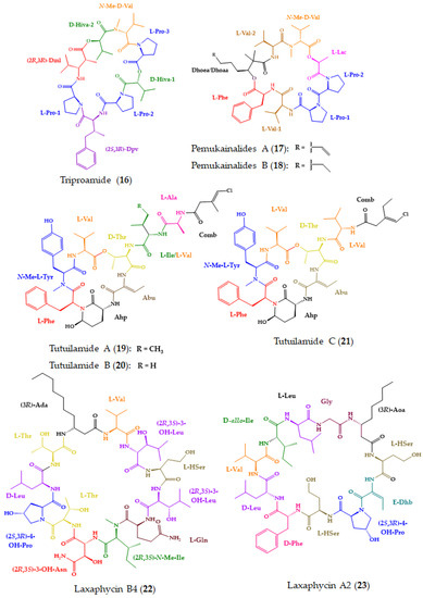 Cyanobacteria are also an important source of new marine-derived cyclopeptides [191,192]. Compounds 12–23 (Figure 7) with anticancer activity were discovered in 2018.