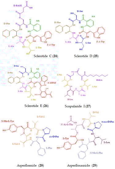 Cyclopeptides have also been isolated from a myriad of marine-derived fungi, mainly from genera Aspergillus, Acremonium, Fusarium, and Penicillium [193]. Marine-derived fungi represent a potential source for bioactive natural products, and an increasing number of new fungal metabolites, including peptides, have been discovered over the past years [194,195]. In addition, peptides isolated from the association of fungi with other macroorganisms produced a valuable and extra-large chemical database, exhibiting relevant biological activities [196]. From 2018, six marine-derived cyclopeptides (24–29) with anticancer activity were isolated from marine-derived fungi (Figure 8).