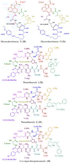 From a deep-sea marine sponge, Pachastrella sp., two new peptides, microsclerodermins N and O (30 and 31) (Figure 9), were isolated [161]. Compounds 30 and 31 have unique structures since they possess a p-ethoxyphenyl moiety instead of a typical p-methoxyphenyl moiety at the terminus of the ω-phenyl-polyhydroxylated β-amino acid unit. The absolute configurations of all the stereogenic centers were determined by Marfey’s method and were found to be identical with other microsclerodermins. For a stereochemical study, a naphthalene-bonded stationary phase was used. Relevant cytotoxic activity was observed for both compounds against HeLa cells, with an IC50 of 0.77 µM and 0.81 µM, respectively. The positive control, doxorubicin hydrochloride, showed an IC50 value of 0.27 µM [161].