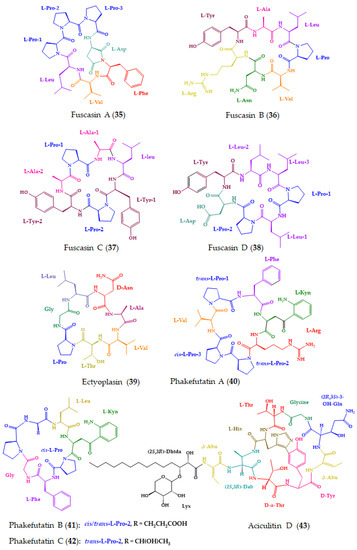 A number of peptides and depsipeptides with intriguing structures and interesting biological activities have been discovered from marine sponges [198,199], some of which were shown to be produced by symbiotic microorganisms [27]. From 2018, 14 marine-derived cyclopeptides (30–43) (Figure 9) were isolated from marine sponges and from sponge-associated microorganisms.