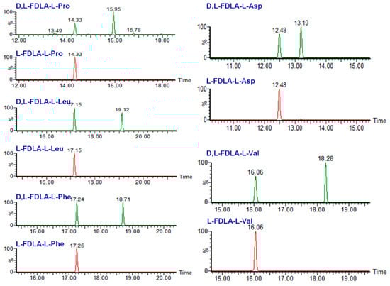 In order to develop a highly sensitive analytical Marfey’s method capable of rapidly and unambiguously determining the absolute configurations and enantiomer regiochemistry for all commonly found amino acids, Vijayasarathy et al. [102] developed the C3 Marfey’s method. This method is a more refined variation on the existing Marfey’s method, using the same CDRs (l-FDAA and d-FDAA) but with a C3 LC column held at 50 °C, and a H2O/MeOH gradient elution modified by isocratic 1% HCO2H in CH3CN, and taking advantage of both UV (340 nm) and (±)-ESIMS detection. This method was shown to be very effective, allowing the stereochemical assignments of all amino acids, including isoleucine stereoisomers. Moreover, the residual Marfey’s reagent did not obscure any target amino acid [102].