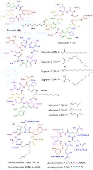 Bacicyclin (44) (Figure 11), a new cyclic hexapeptide, was isolated from a culture broth of Bacillus sp. strain BC028, which is associated with Mytilus edulis, and this was collected from the Kiel Fjord (Baltic Sea, Germany). The planar structure of 44 was elucidated by an extensive analysis of 1D and 2D NMR and HRESIMS spectra. Marfey’s method was used to determine the absolute configurations of the amino acid constituents and revealed that, in all cases, the amino acids of the building block have the l-configuration, except for alanine and phenylalanine, which had a d-configuration. Compound 44 showed antibacterial activity against the clinically relevant strains Enterococcus faecalis JH212 and S. aureus NTCT8325, with minimal inhibitory concentration (MIC) values of 8 and 12 µM, respectively. Streptomycin was used as a positive control and exhibited an MIC value of 5.24 mM against E. faecalis and 2.09 mM against S. aureus, respectively [167].