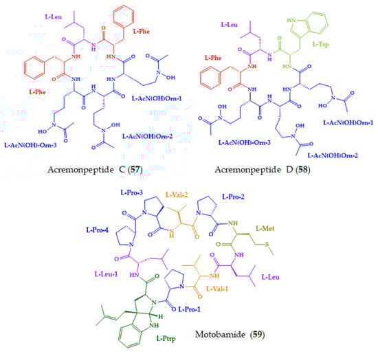 Acremonpeptides A–D (55–58) (Figure 11), new hydroxamate-containing cyclopeptides, were obtained from Acremonium persicinum SCSIO 115, which was isolated from a marine sediment sample collected in the South China Sea. The planar structures of 55–58 were established based on the interpretation of HRESIMS and 1D and 2D spectra, and the absolute configurations of the amino acid residues were established using Marfey’s method. Compounds 55–58 feature three 2-amino-5-(N-hydroxyacetamido)pentanoic acid (N5-hydroxy-N5-acetyl-L-ornithine) metal ion chelating moieties. Compounds 55–57 exhibited antiviral activity against Herpes simplex virus 1 with effective concentration in 50% of the population (EC50) values of 16, 8.7, 27, and 24 μM, respectively. The EC50 value of ganciclovir, a positive control, was 0.025 μM [172].