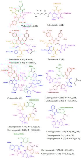 Among the 91 new marine-derived cyclopeptides isolated from various marine sources, 15 (60–74) (Figure 12) were tested for other bioactivities, some of which showed promising results.