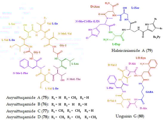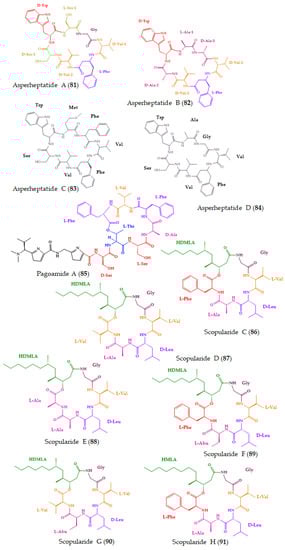 Among the 91 new marine-derived cyclopeptides reported herein, 17 (75–91) (Figure 13) were devoid of any activities in the assays performed. Consequently, these compounds should be evaluated for their potential biological effects in other available assays.