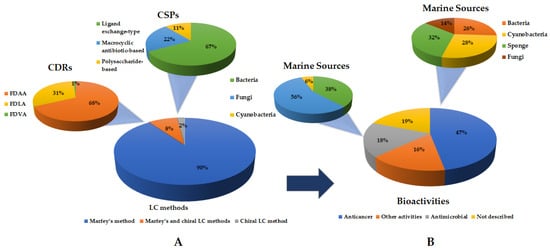 A literature survey from 1996 to 2017 covering all the reports on chromatographic methods for the absolute stereochemistry determination of marine peptides revealed that Marfey´s method and/or chiral LC are very efficient and widely used [110]. Moreover, 52% of the reports described the use of Marfey’s method, 21% employed chiral LC analysis, and 27% included the application of both methods. In some cases, a combination of both methods are found to be necessary for the absolute configurations assessment of all the amino acid residues [110]. In addition, LC methods are also widely used for the assignment of the absolute configurations of peptides isolated from natural sources other than marine organisms [111,112,113,114].