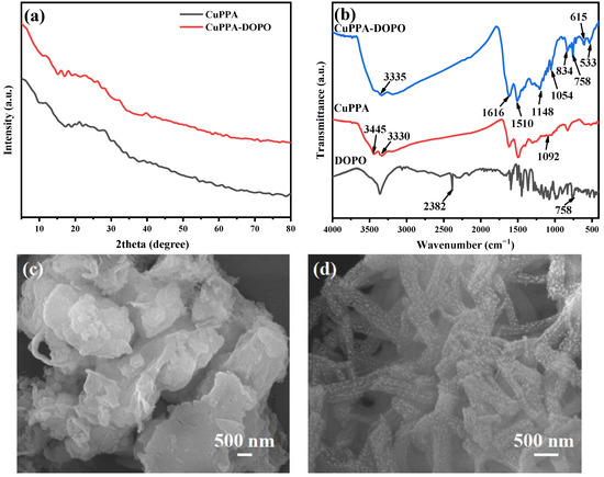 (a) XRD patterns of CuPPA and CuPPA-DOPO; (b) FTIR spectra of CuPPA and CuPPA-DOPO; (c) SEM image of CuPPA; (d) SEM image of CuPPA-DOPO.
