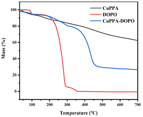 The thermal decomposition behavior of CuPPA, DOPO and CuPPA-DOPO was obtained by TGA, as plotted in Figure 2. The decomposition of CuPPA-DOPO has three stages of weightlessness. The first weight loss (5.8 wt%) occurred at 30–105 °C, and was mainly the desorption of adsorbed water and a small amount of organic solvents [28]. The next weight loss was 14.2 wt% after 105–306 °C, accompanied by the decomposition of phosphaphenanthrene into small molecules [29]. The most intense weight loss was 52.0 wt% after 306 °C, attributable to the decomposition of metal compounds and the oxidation of organic molecules such as phosphonates, the phase of which coincided with the decomposition temperature of EP [30].