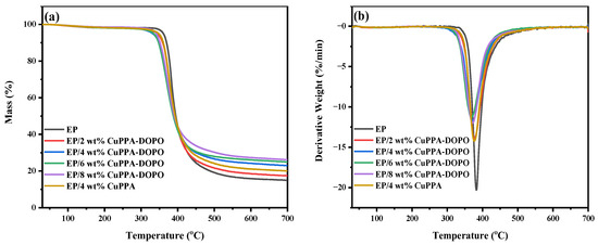 The thermal stability of EP nanocomposites is an important evaluation index of fire safety. TGA and DTG curves and relevant data of EP nanocomposites are shown in Figure 3a,b and Table 1. The initial decomposition temperature (T5%) of EP was 360 °C, while EP/CuPPA-DOPO composites displayed lower T5%. Among EP composites, T5% and Tmax (the temperature at maximum pyrolysis rate) of EP/6 wt% CuPPA-DOPO composites were decreased to 333 °C and 368 °C, respectively, demonstrating that CuPPA-DOPO promoted the earlier decomposition of EP composites [31]. However, the promoting effect of CuPPA was not obvious, with T5% and Tmax of 350 °C and 376 °C. The decrease of the maximum decomposition rate of EP/6 wt% CuPPA-DOPO composites also indicates that the presence of CuPPA-DOPO delayed the degradation of the EP at a higher temperature [32]. Moreover, the incorporation of CuPPA-DOPO improved the char-forming ability of the EP composites. The residues of EP composites were increased to 17.4%, 23.0%, 24.9% and 26.1%, respectively, when the amounts of CuPPA-DOPO were 2, 4, 6 and 8 wt%. The residue of EP/4 wt% CuPPA composites at 700 °C was 19.8%, which is higher than that (14.9%) of pure EP, but lower than that of EP/4 wt% CuPPA-DOPO. The outstanding char-forming ability of EP is attributed to the polyphosphoric substances and metallic oxide produced in the early decomposition of CuPPA-DOPO [33,34].
