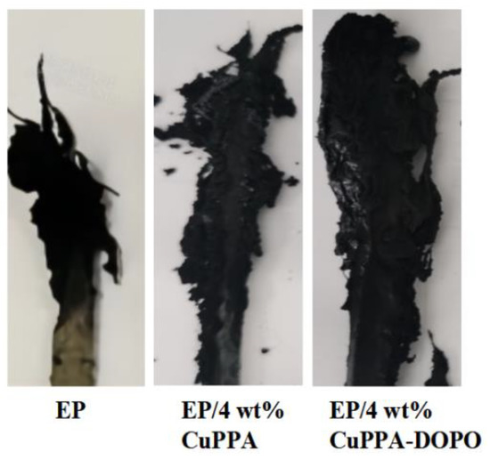 The results of UL-94 vertical burning and LOI test of EP/CuPPA-DOPO composites are shown in Table 2. EP composites all reached a UL-94 V-1 rating, and the LOI values increased to 28.8%, 30.8%, 32.6% and 31.4% when adding 2, 4, 6 and 8 wt% CuPPA-DOPO, respectively, while EP was evaluated as no grade and the LOI value increased only to 25.9%. EP/6 wt% CuPPA-DOPO composites had the best flame-retardant effect. The flame retardancy of EP/8 wt% CuPPA-DOPO composites was slightly poor, which may have been due to the poor dispersibility caused by the excessive dosage, degrading the fluidity of EP/CuPPA-DOPO composites and greatly promoting the combustion of EP composites [35,36]. However, UL-94 reached grade V-1 with 45.2 s, and the LOI value was only 28.2% when 4 wt% CuPPA was added, indicating that the flame retardancy of CuPPA was not as good as that of CuPPA-DOPO. In addition, some of the following features can be seen from the LOI char image in Figure 4. The residue of EP/4 wt% CuPPA-DOPO composites was dense and not easily broken, and more than that of EP/4 wt% CuPPA composites, while EP had less residue. In the system of EP/CuPPA-DOPO composites, the phosphoric acid and metal oxides generated by decomposition could also promote the formation of char layer, insulate the heat transfer, limit oxygen exchange, and thus inhibit the further combustion of EP [37,38].