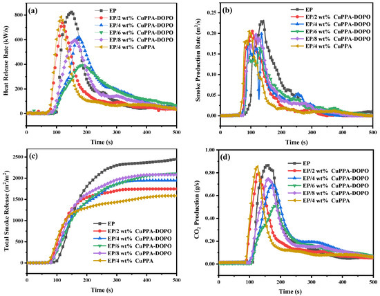 In order to more intuitively and accurately reflect the combustion behavior of EP composites, CCT was conducted to obtain the heat release rate (HRR), smoke production rate (SPR), total smoke release (TSR) and CO2 production (CO2P), as displayed in Figure 5a–d and Table 3. The PHRRs of EP composites declined to 739, 617, 390 and 597 kW/m2 with the addition of 2, 4, 6 and 8 wt% CuPPA-DOPO, respectively, representing decreases of 10.1%, 24.9%, 52.5% and 27.4% compared with that (822 kW/m2) of pure EP. The PHRR of EP/4 wt% CuPPA composites was 784 kW/m2, 4.6% lower than that of pure EP, which indicates that CuPPA-DOPO had a better inhibitory effect on the combustion of EP than CuPPA. The decrease of PHRR can be interpreted as being a result of H2O, CO2 and NH2 released by the decomposition of CuPPA-DOPO diluting the concentration of combustible volatile matter in the gas phase and absorbing part of the combustion heat [39,40].
