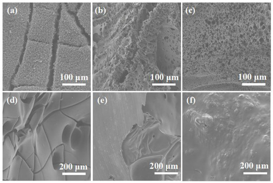 SEM images of external char layer: (a) EP; (b) EP/4 wt% CuPPA; (c) EP/4 wt% CuPPA-DOPO. SEM images of internal char layer: (d) EP; (e) EP/4 wt% CuPPA; (f) EP/4 wt% CuPPA-DOPO.