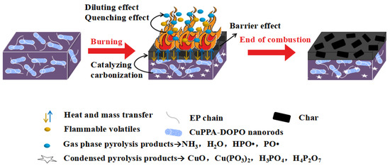 Flame-retardance mechanism diagram of EP/CuPPA-DOPO composites.