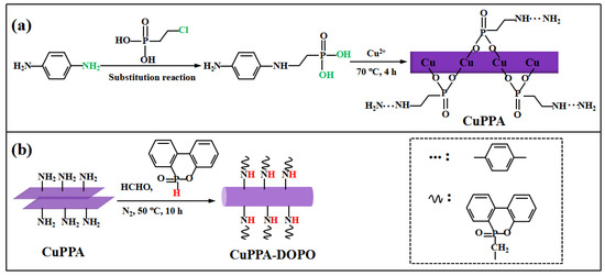 The schematic diagram of CuPPA synthesis is shown in Figure 8a. First, 400 mL deionized water, 7.3 g 2-chloroethyl phosphoric acid, 5.4 g p-phenylenediamine and 0.8 g KI were added into a 500 mL beaker and stirred until the mixture was completely dissolved. Next, 40 mL cold NaOH (1 mol/L) solution was dropped into a beaker and stirred for 30 min. After reacting at 18 °C for 48 h, 6.8 g CuCl2·2H2O was added into the mixture and the mixed system was continuously stirred for 4 h at 70 °C under magnetic agitation. Finally, the flask was aged for 24 h. The precipitates were filtered and washed with deionized water, then followed by vacuum drying at 80 °C for 24 h.