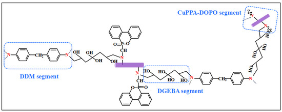 Firstly, CuPPA-DOPO was dispersed in acetone and sonicated for 30 min. The preheated EP matrix was added in the mixture for 30 min of ultrasonic. Next, the mixture was stirred at 90 °C for 4 h until the acetone was completely removed. Then, DDM (mass ratio of EP matrix to DDM was 4:1) was added to the dispersion and stirred until DDM was completely dissolved. Then, the mixture was quickly poured into the preheated silicone rubber mold and cured at 100 °C for 2 h. Finally, the splines were transferred to the drying oven and cured at 110 °C/2 h, 130 °C/2 h, 150 °C/2 h. The specific contents and curing reaction of EP composites are shown in Table 4 and Figure 9.