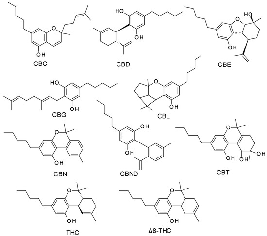 The term cannabinoid refers to both natural cannabinoids (endocannabinoids; phytocannabinoids) and synthetic cannabinoids that operate on cannabinoid receptors. Phytocannabinoids refer to a group of oxygenated aromatic hydrocarbon metabolites derived from the Cannabis plant that contain 21 carbon atoms. Currently, phytocannabinoids are conventionally classified into 11 chemical classes, each named after the “lead” compound: cannabichromene (CBC), cannabidiol (CBD), cannabielsoin (CBE), cannabigerol (CBG), cannabicyclol (CBL), cannabinol (CBN), cannabinodiol (CBND), cannabitriol (CBT), tetrahydrocannabinol (THC), (−)-Δ8-trans-tetrahydrocannabinol (Δ8-THC), and miscellaneous phytocannabinoids (Figure 1) [5]. The existing heterogeneity in phytocannabinoid concentration between and among different chemotypes has significant implications for medical cannabis formulations and administration [6].