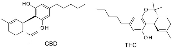 While CBD is chemically related to THC (the difference is that CBD is a bicyclic while THC is a tricyclic compound, but the molecular mass is the same) (Figure 2), CBD has shown significant tolerance in humans with limited abuse potential. CBD’s good safety profile has resulted in the recent reduction of legal and regulatory restrictions, made CBD products available in numerous countries, and led to a surge in interest in CBD treatment [9]. This led to the situation that CBD therapeutic demand has outpaced scientific research and regulatory development, creating a complex ecosystem of disinformation and dubious health claims.