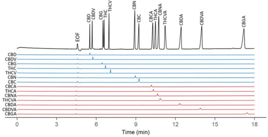 CE electropherograms of 14 cannabinoids in a standard mixture and individually (electrophoretic conditions: 6.5 mM sodium hydroxide in acetonitrile:water (60:40) mixture, 25 mM µM β-CD, 45 V/cm, UV detection 230 nm, sample concentration 50 µg/mL; Blue electropherograms—decarboxylated forms of cannabinoids (CBD—cannabidiol, CBDV—cannabidivarin, CBG—cannabigerol, THC—tetrahydrocannabinol, THCV—tetrahydrocannabivarin, CBN—cannabinol, CBC—cannabichromene), red electropherograms—carboxylated forms of cannabinoids (CBCA, THCA, CBNA, THCVA, CBDA, CBDVA, and CBGA)). The figure is reproduced from Zaripov et al. [31] with permission from MDPI.