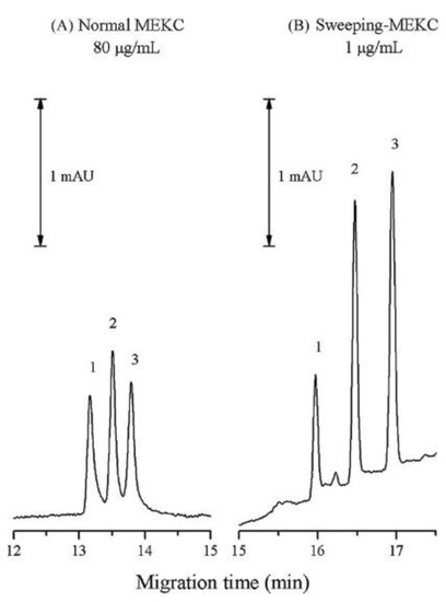 Comparison between the normal MEKC and sweeping-MEKC methods for simultaneous separation of THC and its metabolites (analytical conditions (A)—25mM citric acid/disodium hydrogenphosphate BGE, 75 mM SDS, pH 2.6, 40% methanol, 25 °C, −20 kV, injection 3.45 kPa × 3 s, sample concentration, 80 µg/mL; (B)—25mM citric acid/disodium hydrogenphosphate BGE, 75 mM SDS, pH 2.6, 40% methanol, 25 °C, −20 kV, injection 3.45 kPa × 300 s, sample concentration, 1 µg/mL). Peaks: (1) THC; (2) THC-COOH; (3) THC-OH. The figure is reproduced from Su et al. [36] with permission from Elsevier.