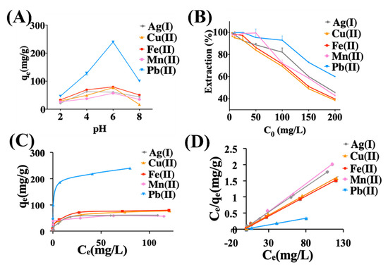 Adsorption of metal ions by rGO. (A) Effect of pH values on the adsorption capacity of Ag (I), Cu (II), Fe (II), Mn (II), and Pb (II), showing optimal adsorption at pH = 6. Metal ion concentration is 200 mg/L (ppm). (B) Effect of the initial concentration on the extraction of metal ions (C0 = 5–200 mg/L, ppm). (C) Plot of qe versus Ce and (D) Experimental data and the fitted Langmuir isotherm based on the plot of Ce/qe versus Ce. Experiment conditions. Adsorbent dose: Ag (I) = 30 mg/20 mL, Cu (II) = 20 mg/20 mL, Fe (II)=20 mg/20 mL, Mn (II) = 30 mg/20 mL, and Pb (II) = 10 mg/mL. Temperature = 25 ± 2 °C, Ph = 6, contact time = 48 h.