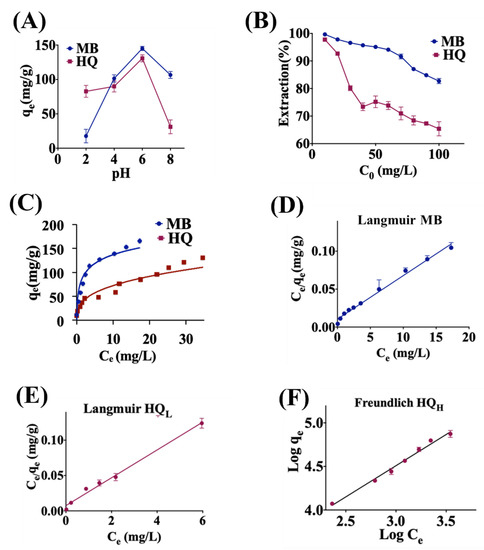 Adsorption isotherms of rGO for MB and HQ. (A) Adsorption capacity as a function of pH for MB and HQ. MB and HQ concentrations: 100 mg/L (ppm). (B) Extraction (%) as a function of C0 for MB and HQ. (C) Plot of qe versus Ce for MB and HQ. (D) Fitted Langmuir isotherm for MB (Ce/qe vs. Ce), from which a maximum capacity of qmax = 238.45 mg/g is extracted. (E) Fitted Langmuir isotherm based (Ce/qe vs. Ce) for low concentration HQ (HQL, 5–30 mg/L), from which a qmax = 51.02 mg/g is extracted. (F) Freundlich isotherm (Log qe vs. Log Ce) for high concentration HQ (HQH, 40–100 mg/L), from which a KF = 1.229 is extracted. Experiment conditions for MB and HQ: Adsorbent dose: 10 mg/20 mL. Temperature = 25 ± 2 °C, pH = 6, contact time = 48 h.