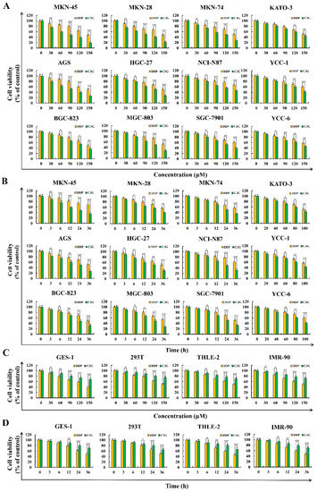 Cytotoxic effects of C3G and DDP were detected using a CCK-8 assay. (A) Various concentrations (30, 60, 90, 120, and 150 µM) of C3G and DDP on the toxicity of 12 human GC cell lines. (B) Various time points (3, 6, 12, 24, and 36 h) of C3G and DDP treatment on the toxicity of 12 human GC cell lines. (C) Various concentrations (30, 60, 90, 120, and 150 µM) of C3G and DDP on the toxicity of four normal cells. (D) Various times point (3, 6, 12, 24, and 36 h) of C3G and DDP on the toxicity of four normal cells (* p ≤ 0.05, ** p ≤ 0.01, *** p ≤ 0.001 vs. DDP group).