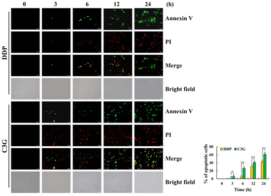 Apoptotic effects of C3G on MKN-45 cells. The fluorescence intensity and morphology of MKN-45 cells after Annexin V and PI painting were observed (original magnification 200×) (* p ≤ 0.05, *** p ≤ 0.001 vs. 0 h).