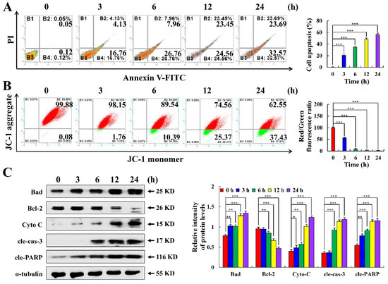 Apoptotic effects of C3G on MKN-45 cells. (A) The rate of apoptotic cells was determined using flow cytometry. (B) MMP was detected using flow cytometry. (C) The protein expression level of MKN-45 cells treated with C3G was detected using Western blot. α-tubulin served as an internal reference (* p ≤ 0.05, ** p ≤ 0.01, *** p ≤ 0.001 vs. 0 h).