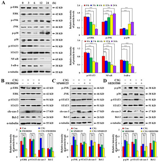 Effects of C3G on the MAPK signaling pathway in MKN-45 cells. (A) Western blot analysis of MAPK/STAT3/NF-κB pathway-related protein expression. (B) Expression levels of proteins treated with C3G and ERK inhibitors. (C) Expression levels of proteins treated with C3G and JNK inhibitors. (D) Expression levels of proteins of treated with C3G and p38 inhibitors. α-tubulin served as an internal reference (* p ≤ 0.05, ** p ≤ 0.01, *** p ≤ 0.001 vs. 0 h or C3G + MAPK inhibitor).