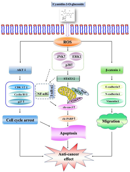 ROS are necessary for many signal transduction pathways and can trigger the physiological pathways of cell apoptosis [36]. Helicobacter pylori induces increased activation of ROS, MAPK, and NF-κB in AGS cells, but the ROS levels in AGS cells decrease after anthocyanin pretreatment [30]. Our results showed that the ROS levels of MKN-45 cells increased after C3G treatment, while the ROS levels of human gastric epithelial GES-1 cells decreased after C3G treatment. We believe that C3G has a strong antioxidant activity, but the molecular pathways in normal cells and cancer cells differ from one another, involving different signaling pathways, which needs to be investigated further. C3G can provide effective protection against the adverse effects of ultraviolet B radiation, by regulating the MAPK and NF-κB signaling pathways [14], and can also inhibit breast cancer angiogenesis, by inhibiting the STAT3 pathway [15]. As a natural active ingredient, anthocyanin can block the proliferation of various tumor cells through the terminal differentiation of tumor cells, and further induce the apoptosis of tumor cells through the STAT3 and NF-κB signaling pathways regulated by ROS. At the same time, anthocyanin can eliminate free radicals in the body and generate antioxidant activity, thus achieving the effect of preventing the generation of tumor cells [37,38,39]. In this study, C3G induced the apoptosis of MKN-45 cells by regulating the MAPK, STAT3, and NF-κB signaling pathways, consistently with previous studies.