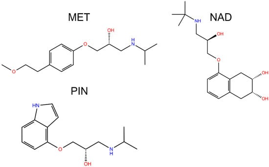 The World Health Organization noted in its reports that pharmaceuticals are present in natural and treated water in concentrations from 0.1 to 0.05 mg/L [1]. Among all pharmaceuticals, a large increase was noted for β-blockers due to an increase in cardiovascular diseases [2]. Because of their moderately high solubility [3] and incomplete removal by wastewater treatment plants, β-blockers are persistent in water environments and they may show potential toxic properties against nontarget organisms, i.e., aquatic organisms and even human health. For example, metoprolol (MET, Figure 1) is one of the most used medicines in this class, and its usage increased four times in recent years [4]. Pindolol (PIN, Figure 1) possesses lipophilic properties and at natural pH is almost completely insoluble in water [5,6]. Nadolol (NAD, Figure 1) is another medicine from the β-blockers class, which is highly soluble in water and hydrolytically stable, and thanks to that property, is highly bioavailable in the environment [7,8]. Usually, β-blockers are present in the environment in combination with other β-blockers and various organic pollutants. Their mutual reactions may manifest additional health and environmental risks caused by unexpected interactions between them.